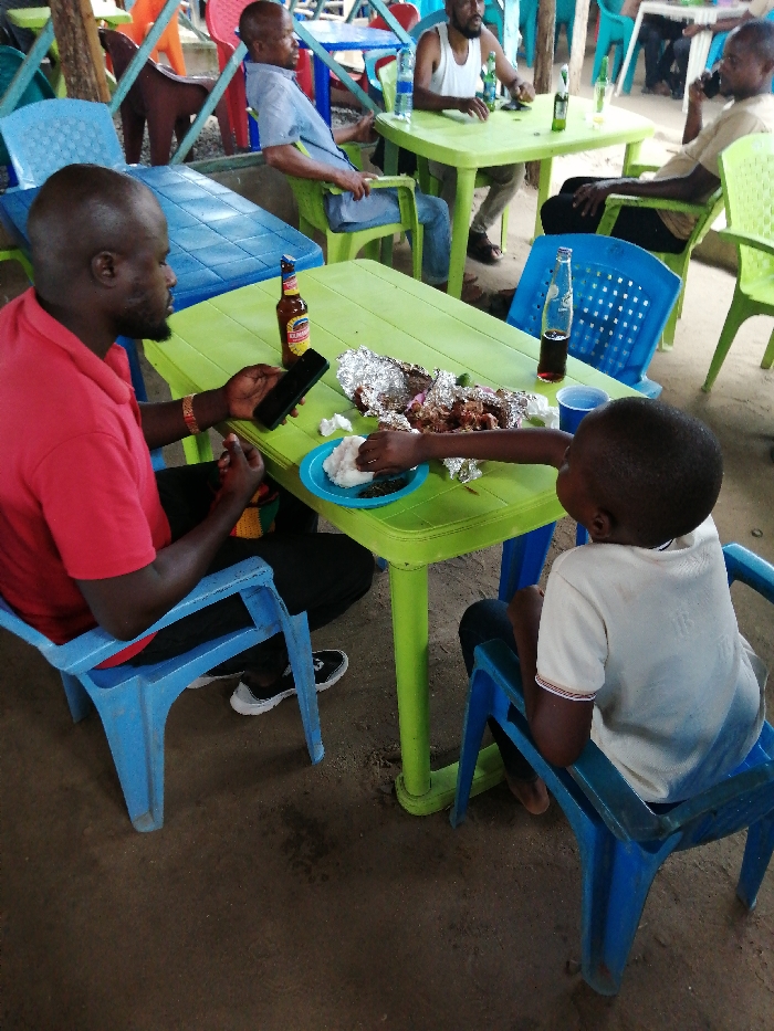 Outdoors, three tables are occupied. One table has a man in a red shirt looking at his phone, a child reaching for food on a plate, and a beer bottle. Another table has two men with beer bottles. The third table has a man on his phone and a man looking into the distance. All tables have green tops and are surrounded by colorful plastic chairs. The ground is sandy.