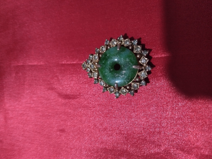 A single, triangular-shaped piece of jewelry is displayed on a red, slightly wrinkled, satin-like fabric background. The central element of the jewelry is a circular, donut-shaped green stone, consistent with jade, which features a mottled surface and a central perforation. This stone is secured by gold-toned metal prongs within its setting. The outer perimeter of the jewelry is composed of numerous small, clear, faceted stones, possibly rhinestones, individually set in gold-toned metal, forming a radiant, triangular border around the central green stone. The red fabric exhibits a subtle sheen and minor creases. A distinct shadow of the jewelry piece is cast on the lower right portion of the fabric, indicative of a directional light source. No individuals or additional objects are present in the scene, which is situated in an indoor environment in České Budějovice, Czechia.