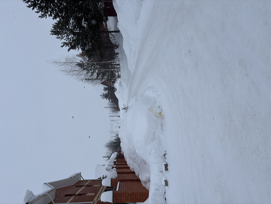 A snow-covered landscape includes a snow-filled road with drifts and visible tire tracks