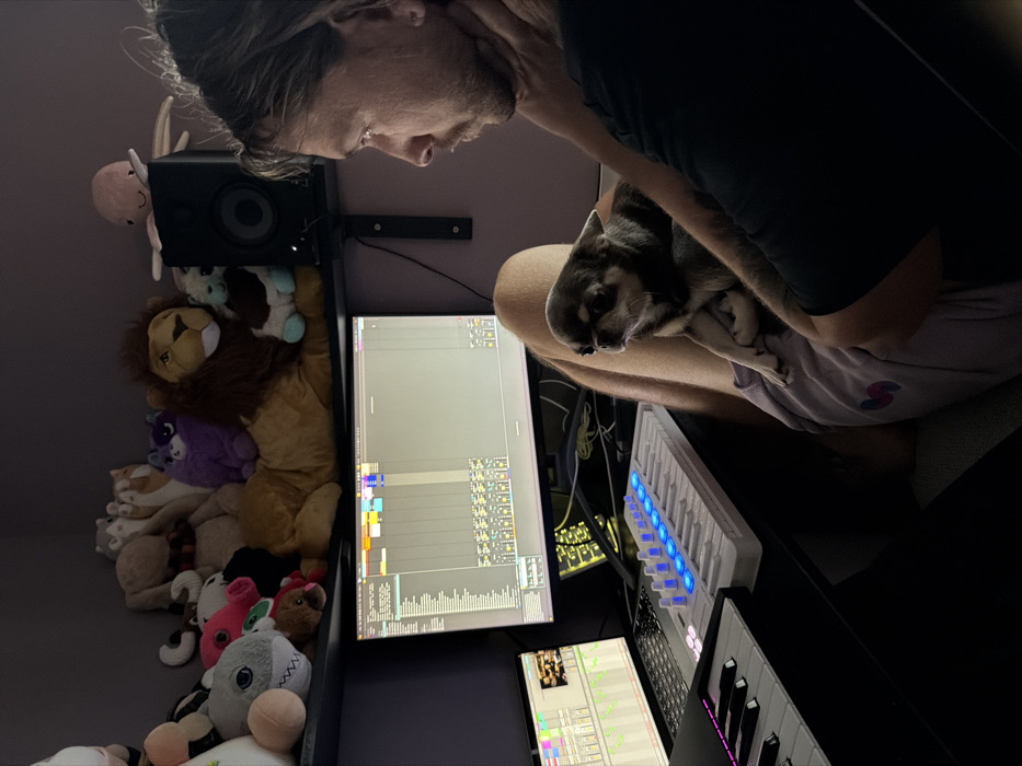 In Boreti, Montenegro, a dimly lit indoor scene depicts a male individual and a small dog at a desk setup. The man, with light brown hair and a beard, is visible from the right side, facing left towards a computer monitor. He wears a dark t-shirt and light-colored shorts, with his right arm bent and hand near his neck. A small, short-haired Chihuahua-type dog, dark brown with lighter markings, sits composedly on his lap, facing left with its front paws crossed. The desk holds a primary large computer monitor displaying music production software. To its left, an open laptop, an Apple MacBook Pro, also shows a similar software interface. A white MIDI controller, featuring several blue-illuminated pads and knobs, rests on the desk between the laptop and the man. A second, smaller MIDI keyboard is partially visible to the left of the laptop. Behind the equipment, cables are visible. Above the main monitor, a black studio monitor speaker is mounted on a dark shelf. This shelf also holds a collection of various stuffed animals, including a large lion, a grey shark, a pink octopus, and several smaller figures. The room's illumination primarily originates from the computer screens and the MIDI controller's lights, casting the surroundings in a low-light environment.