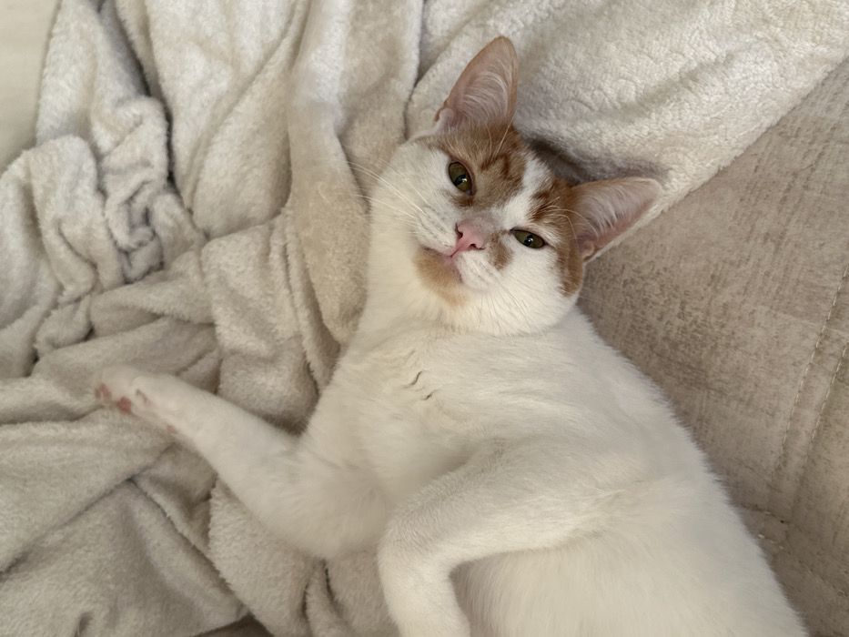 - "In Rusanovo, Russia, a domestic feline subject, predominantly white with light orange markings on its face and ears, is observed lying on its back" by FM-CL1813, licensed under CC BY 4.0