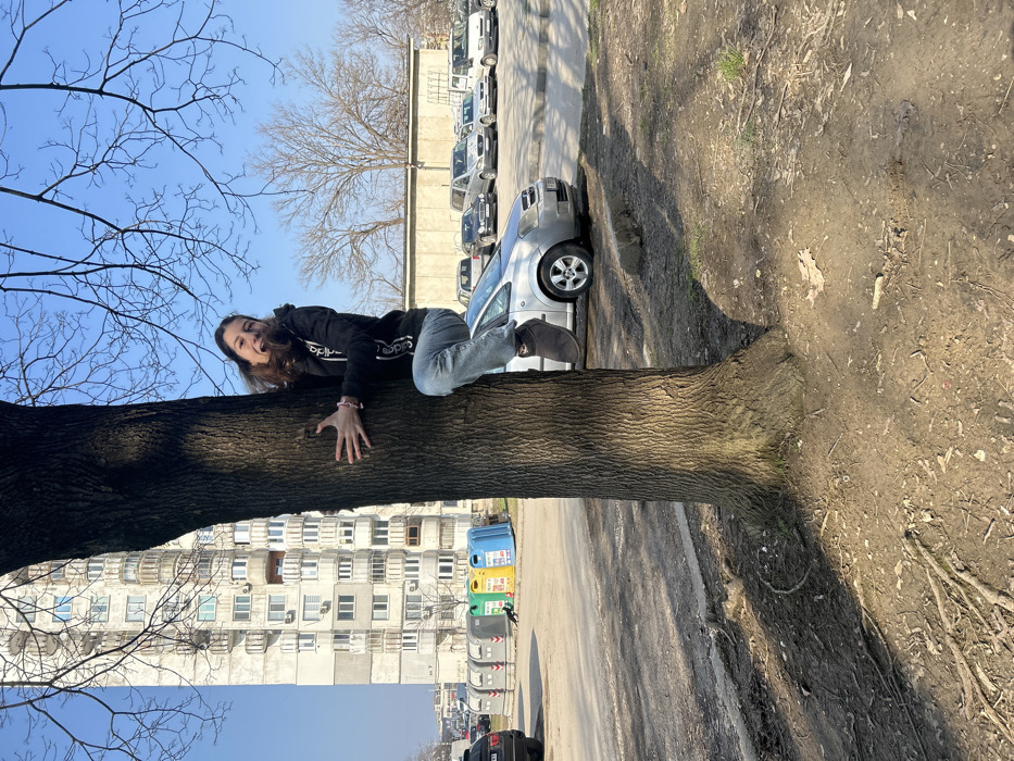The image presents an outdoor urban scene in Ruse, Bulgaria, under a clear, bright blue sky. A female individual with long, dark hair, wearing a black hooded sweatshirt, light blue jeans, and dark low-cut boots, is situated on the trunk of a large, leafless deciduous tree. Her left arm is wrapped around the tree trunk, and her right hand also rests on it, while her legs are bent, with her feet braced against the trunk. Her mouth is open, and her head is slightly tilted, directed towards the camera. The foreground ground consists of dry, light brown soil with visible exposed tree roots. Immediately behind the tree, a silver car is parked. To the left of the tree, a row of municipal recycling bins, colored grey, green, yellow, and blue, stands beside a paved surface. In the background, a tall, multi-story concrete apartment building with numerous balconies and external air conditioning units dominates the left side of the frame. A parking lot filled with various parked vehicles, including sedans and a silver minivan, extends to the right of the building.