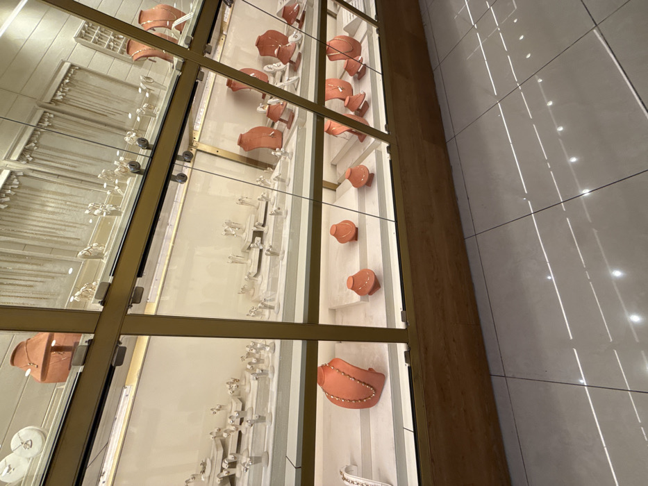 A display case holds jewelry. On the left, necklaces and earrings are on view. The right side showcases necklaces on orange busts. The case is gold-framed with glass panels. Reflective floor tiles are visible on the right side of the image.