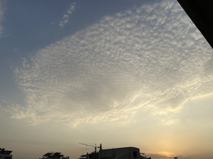 The scene depicts an urban landscape in Kafr Sousa Municipality, Syria, observed during what appears to be either sunrise or sunset. The sky, occupying the upper two-thirds of the image, transitions from clear blue in the upper-left to a warm yellowish-orange near the horizon on the right. A large, rectangular-shaped formation of altocumulus clouds with a distinct ripple or 'mackerel sky' pattern dominates the central and upper-right portions of the sky. A dark, angular structure partially encroaches into the frame from the upper-right corner. The lower third of the image reveals a city skyline. From left to right, visible structures include: a white building featuring rooftop solar panels; another building with multiple black rooftop panels, likely solar; a construction site equipped with at least one prominent tower crane and partially completed building structures; a light-colored building with a discernible circular window or opening; and to the far right, the orange-yellow glow of the sun partially obscured by clouds or haze just above the horizon line. No individuals are discernible within the frame, and no specific actions or interactions are depicted.