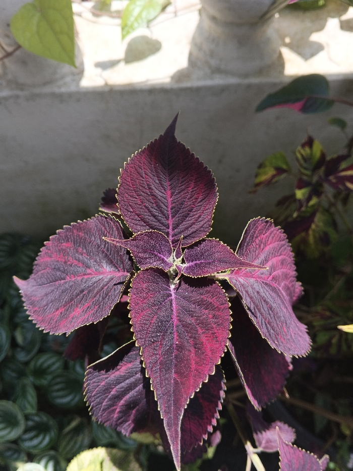 A vibrant coleus plant dominates the frame, showcasing leaves of rich burgundy and deep purple