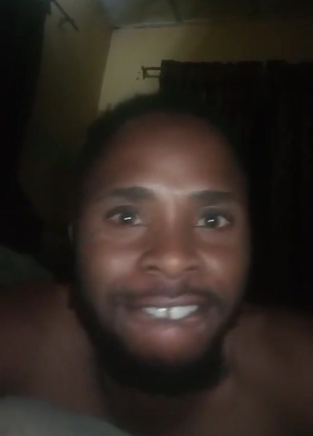 A close-up video shows a shirtless man with a beard, lying in bed. He smiles, opens his eyes wide, and then makes a peace sign with his fingers. The room is dimly lit with a light on the ceiling. A dark curtain is visible in the background.