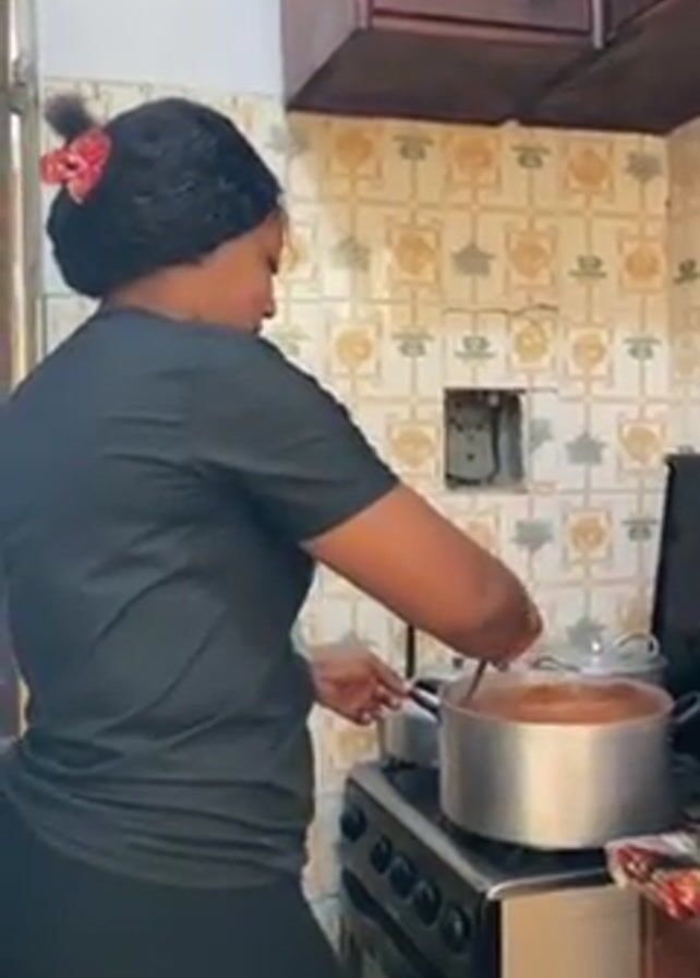 Here's a brief description of the video: A woman wearing a black t-shirt and black leggings is in a kitchen, standing by a stove. She is stirring the contents of a large, silver pot on the stovetop. The kitchen has tiled walls with a geometric pattern. The woman looks toward the camera, smiles, and then continues stirring the pot. Cabinets are visible above the stove.