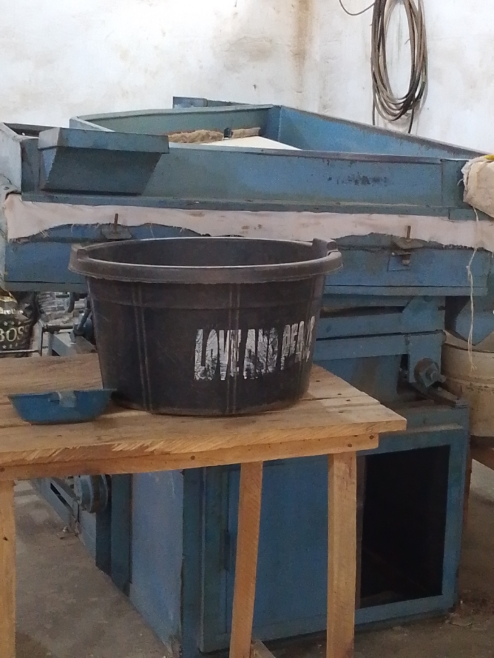 The scene depicts an industrial indoor environment in Olomoda, Nigeria, featuring a large, blue processing machine dominating the background. This multi-level machine has chutes and appears to handle a fibrous, light brown material on its upper surface. A light-colored fabric or tarp is draped across the front of the machine. In the midground, a simple wooden table with visible plank construction holds a large, dark plastic bucket bearing the white inscription "LOVE AND PEACE" on its side. To the left of the bucket on the table, a small, light blue, shallow bowl is present. The background wall is light-colored with some discoloration, and coiled cables or hoses hang from it in the upper right. A partial view of a bag with "BOS" text is visible behind the table to the left. No individuals are present, and no actions or interactions are depicted. The floor is a concrete surface.