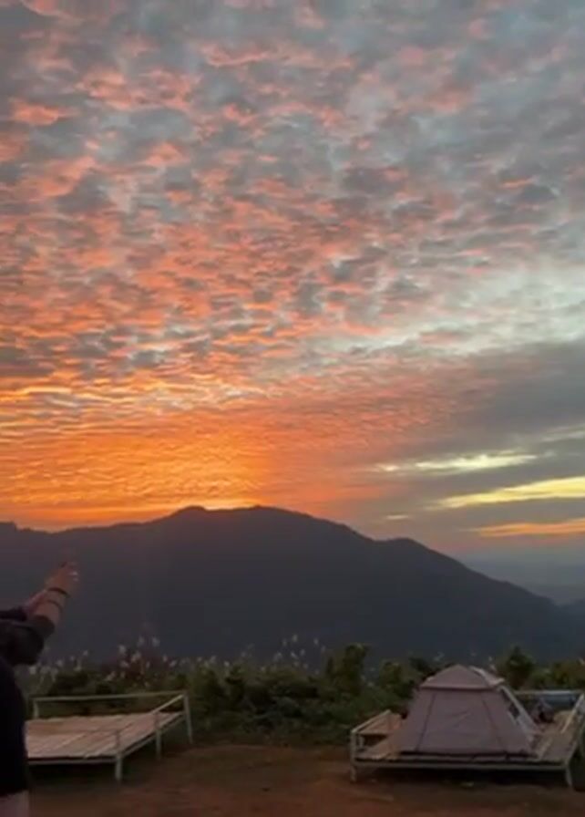 scenic view of a mountain range at sunrise or sunset. The sky is filled with textured clouds, colored with shades of orange, pink, and grey. In the foreground, there are some raised wooden platforms, with a tent set up on one of them. A man appears to be taking a photo with his phone. A woman then walks into frame. There is a white plastic chair on the ground.