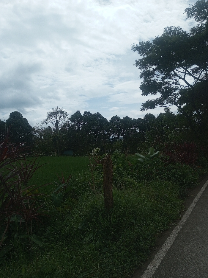 The image depicts an outdoor, rural scene in Sarwahi Mal., India, under an overcast sky. A dark asphalt road with a continuous white edge line runs along the lower right. To the left of the road, a strip of dense green foliage and weeds is present, featuring a weathered wooden post or stump and plants with reddish-brown leaves. Beyond this vegetation, a vivid green field, consistent with a rice paddy, extends into the midground. A faint, dark-colored structure is visible behind the paddy field, partially obscured by trees. A dense line of dark green trees forms the horizon across the midground and background, with a taller, lighter-trunked tree standing out among the canopy. The sky is largely covered by layers of grey and white clouds. No individuals, animals, or active subjects are present.