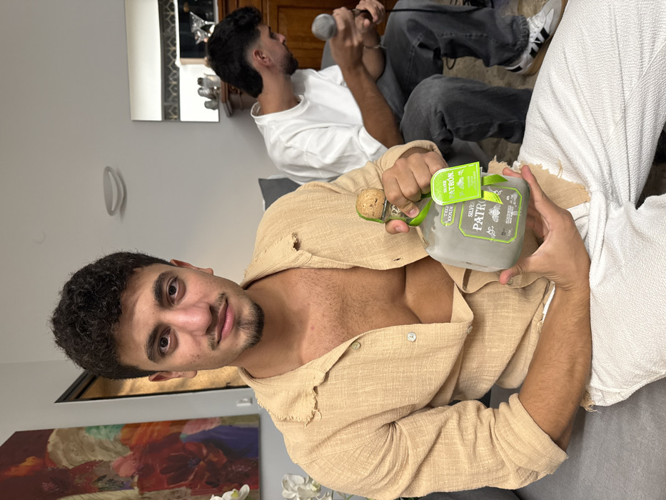 An indoor photograph captures two males within a residential setting in Ramat Gan, Israel. In the foreground, a male with dark, curly hair, a light mustache, and a goatee is seated on a grey upholstered sofa. He wears an unbuttoned, light tan, long-sleeved collared shirt with frayed edges, revealing his chest and abdomen, and white, textured pants with frayed cuffs. He looks directly at the camera with a neutral expression, holding a frosted bottle of Patrón Silver Tequila, complete with a cork stopper and a green label and ribbon, in both hands. In the mid-ground, a second male is partially visible, seated on a dark surface to the right. He has dark hair styled in a mullet and wears a white oversized t-shirt and dark grey jeans. He is looking downwards and to his right, holding a silver-colored microphone in his right hand. The background features a light-colored wall. To the left, a large abstract painting with dominant red, orange, and gold hues is mounted. To the right, a dark wooden cabinet or dresser is positioned below a rectangular mirror with a dark frame. Various decorative items, including clear cocktail glasses, are arranged on the cabinet. A white, circular ceiling light fixture is partially visible above the background subject. A light-colored rug or carpet is partially visible on the floor beneath the background subject.