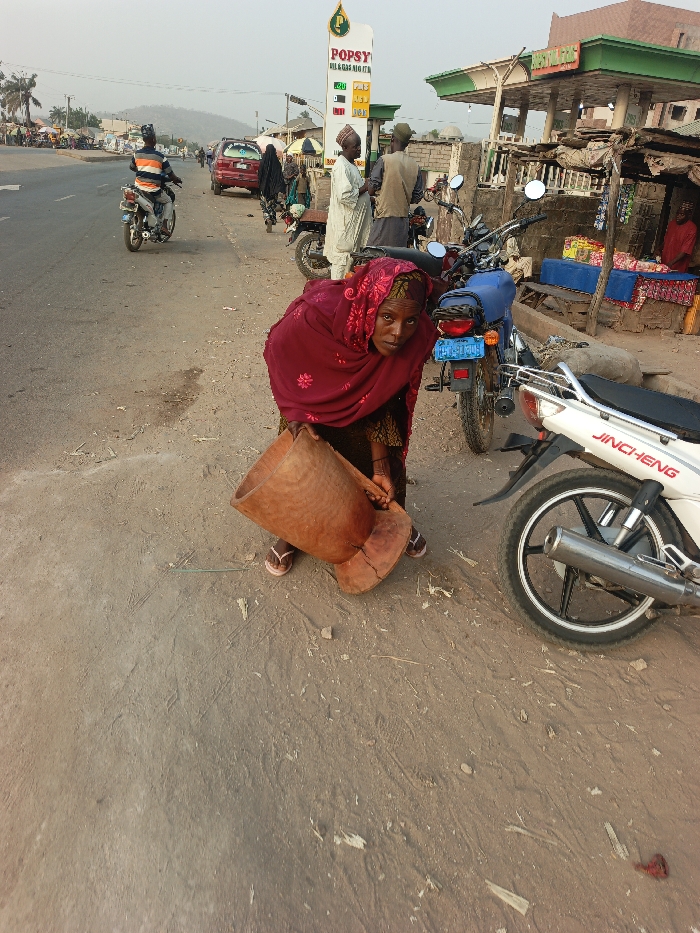 An older woman in a maroon headscarf carries a large, wooden mortar next to motorcycles parked on a dusty roadside. A "POPSY" gas station sign is visible in the background, along with other figures standing nearby. One man is on a moving motorcycle in the background. The scene appears to be in a somewhat rural or less developed area.