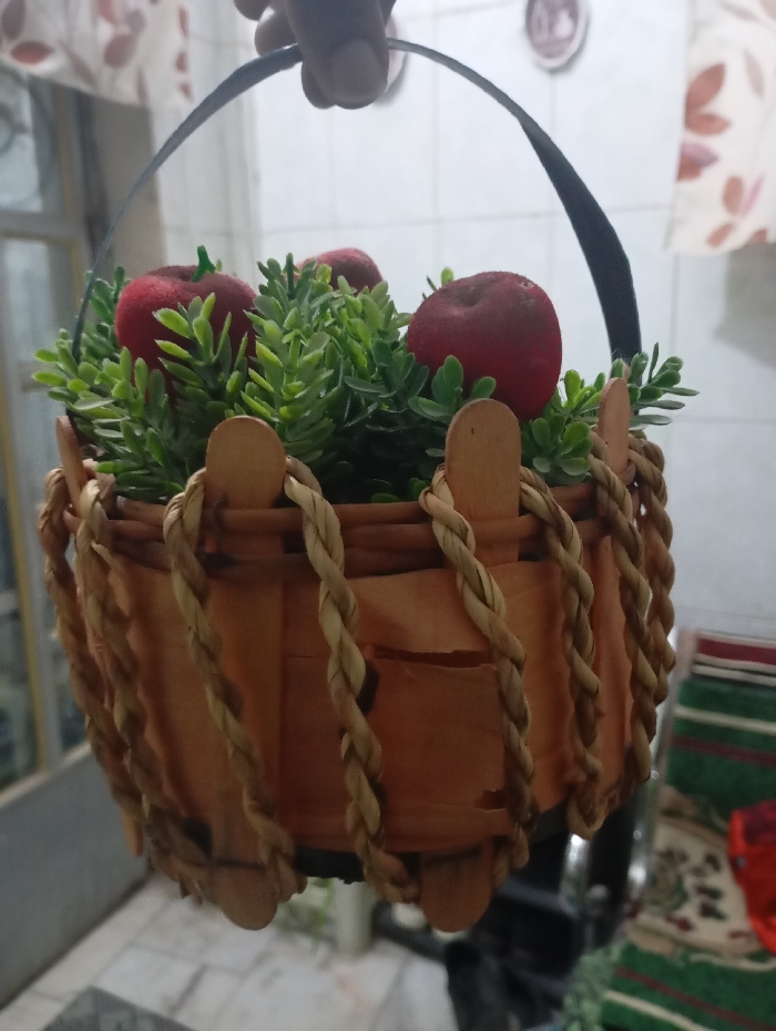 A hand holds a woven basket filled with faux greenery and red apples. The basket's construction features light brown wooden slats held together with twisted rope-like strands. Rounded wooden sticks form a decorative fence around the top. A black handle arches over the arrangement. In the background, a white tiled wall is visible with a partially obscured patterned curtain.