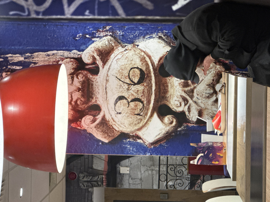 The image displays a wall adorned with various decorations. A prominent feature is a print of an ornate plaque bearing the number "36" on a blue background. To the left, a red, conical lamp stands. A person wearing a black hooded jacket is partially visible, possibly adjusting something nearby. Below the plaque print, there is a fireplace scene depicted, complete with a mantelpiece and decorative metalwork. Some papers and books lie on a desk.