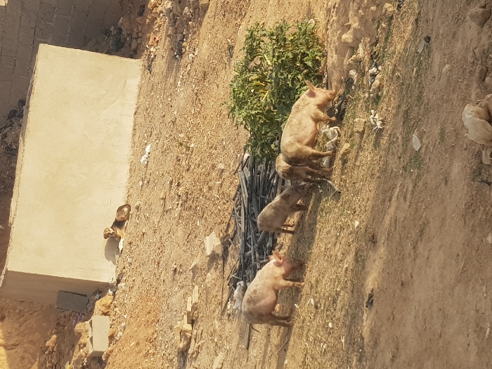 Four pigs roam a dry, dirt-filled environment. A larger pig leads, followed by two smaller ones, and another larger pig trails behind. Nearby, a scraggly green bush grows amidst the dirt. A cement structure sits off to the side, with a dog visible on top. The overall scene gives a sense of neglected or rural conditions.