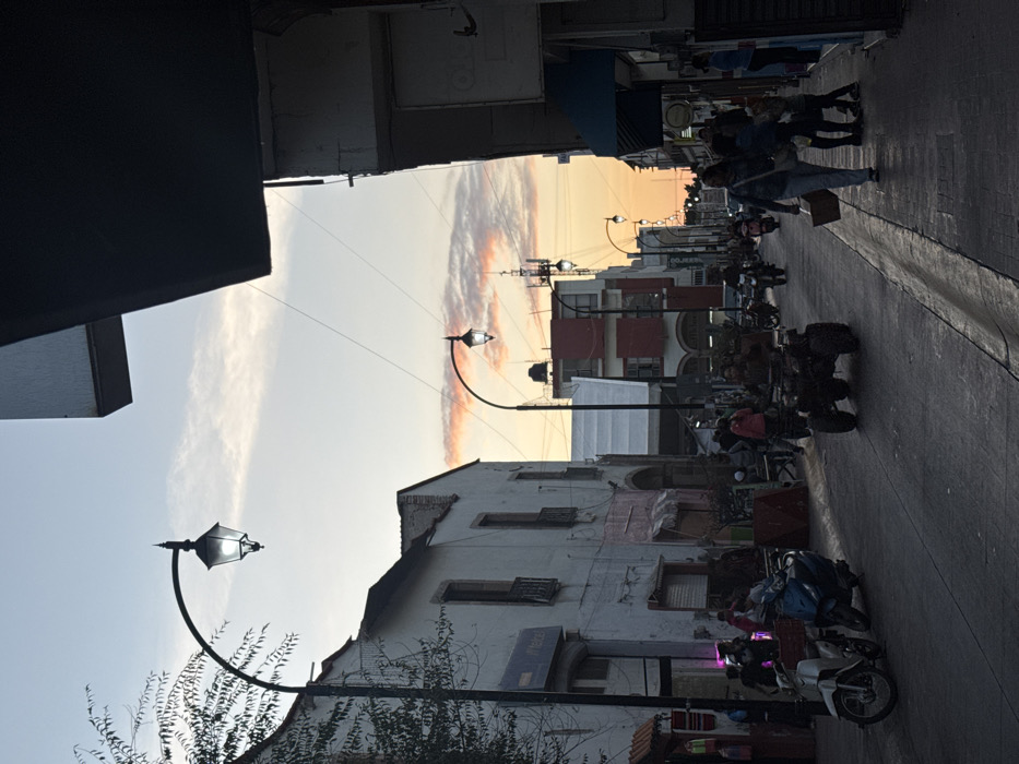 A street scene unfolds with parked motorcycles and ATVs lining the right side. Buildings flank either side, their architecture varying, with some showing signs of age and wear. Streetlights punctuate the scene. Pedestrians stroll further down the street. The sky transitions from a light blue to a soft orange and pink at the horizon.