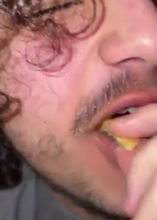 close-up of a person's face. The person has curly hair, a mustache, and is putting a small, yellowish-brown, rectangular food item into their mouth. The person appears to be eating.