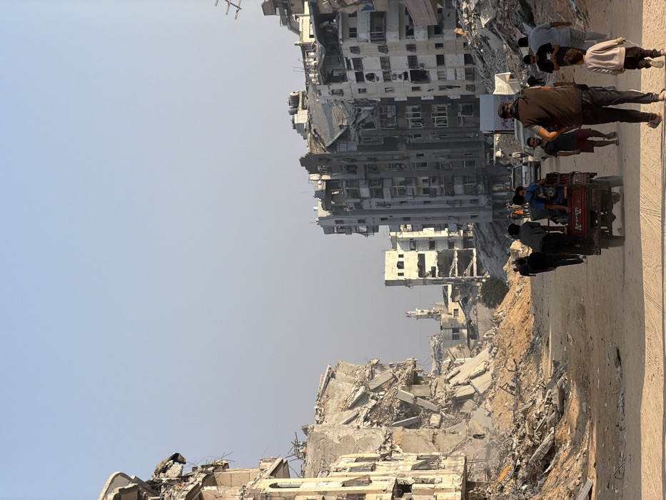 A scene of destruction with collapsed buildings dominating the landscape. In the center, a group of people travels on a vehicle along a road. Other individuals stand nearby, surveying the scene. The buildings are severely damaged, revealing their interiors and structural elements. Debris and rubble cover the ground, emphasizing the scale of devastation. The sky is a muted color, adding to the overall somber atmosphere of the image.