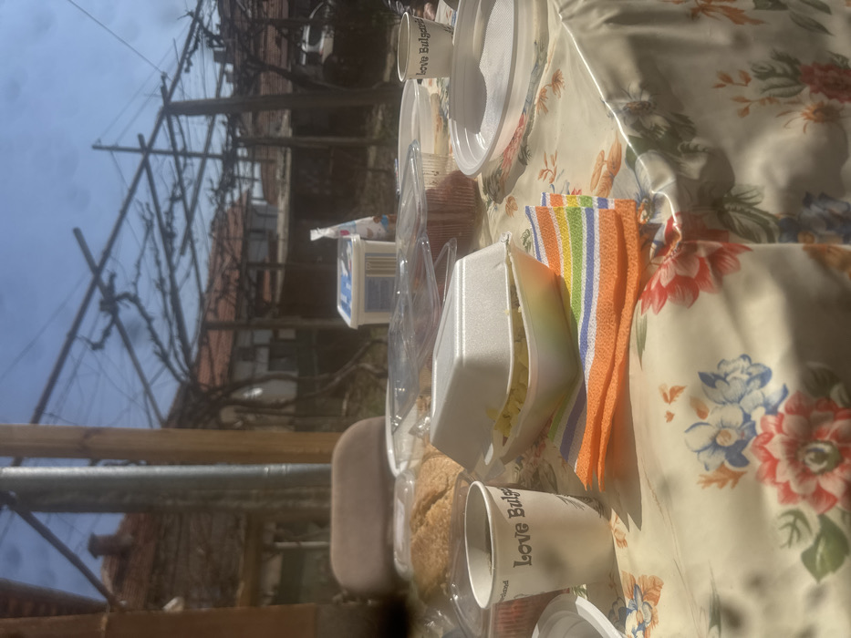 An outdoor scene in Cherven Breg, Bulgaria, depicts a table set for a meal under bright sunlight. The table is covered with a light-colored floral tablecloth featuring red, blue, and orange flowers. Central to the table is a partially open white polystyrene foam take-out container holding yellow and white food, placed on a striped orange, green, blue, and white napkin. Nearby, a white disposable cup with the text "Love Bulgaria" contains a dark liquid. Several clear plastic containers with lids, some containing food items such as sliced meats or pastries, are also on the table, along with white disposable plates and a white plastic tub with a blue label. A light brown, possibly baked good, is visible in another clear container. In the midground, a light brown chair back and supporting poles are present. The background reveals a clear blue sky, an extensive trellis system with bare grapevines, and multiple residential buildings with red tiled roofs, indicative of a backyard or garden setting within the city. No individuals are visible.
