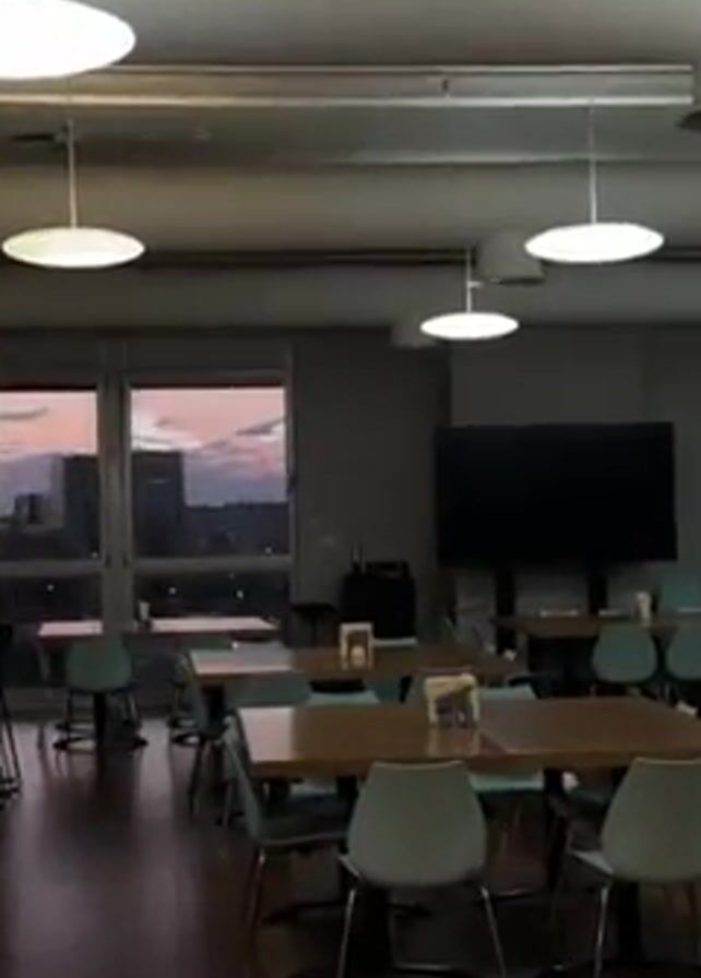 interior of what appears to be a break room or cafeteria space. The room has dark hardwood floors, gray walls, and a drop ceiling with several white, disc-shaped pendant lights. There are several square tables with light blue chairs arranged throughout the room. Large windows reveal a cityscape with a sky showing hues of pink and purple, suggesting either a sunset or sunrise. A large television screen is mounted on one wall. The room is empty of people.
