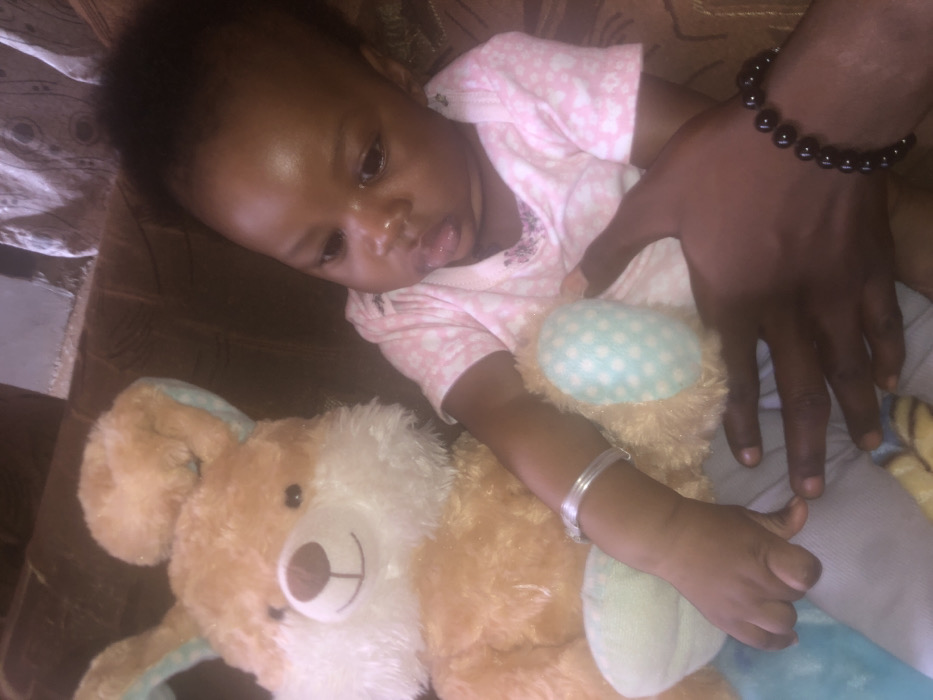 The image displays an indoor scene in Rido, Nigeria. An infant, with dark skin and dark hair, is positioned in the center-right of the frame, facing slightly towards the right. The infant wears a short-sleeved light pink onesie patterned with white shapes and a silver-colored bangle on its left wrist. Its mouth is slightly open. To the infant's left is a large plush toy, resembling a fox or bunny, with light brown fur, a white chest and snout, and light blue polka-dotted fabric on its ears and feet. An adult's dark-skinned left hand is visible in the lower right quadrant, wearing a black beaded bracelet. This hand is positioned as if gently touching the infant's leg or the plush toy's leg. Both subjects appear to be situated on a brown upholstered surface, consistent with a sofa or couch. The background consists of indistinct brown upholstery.