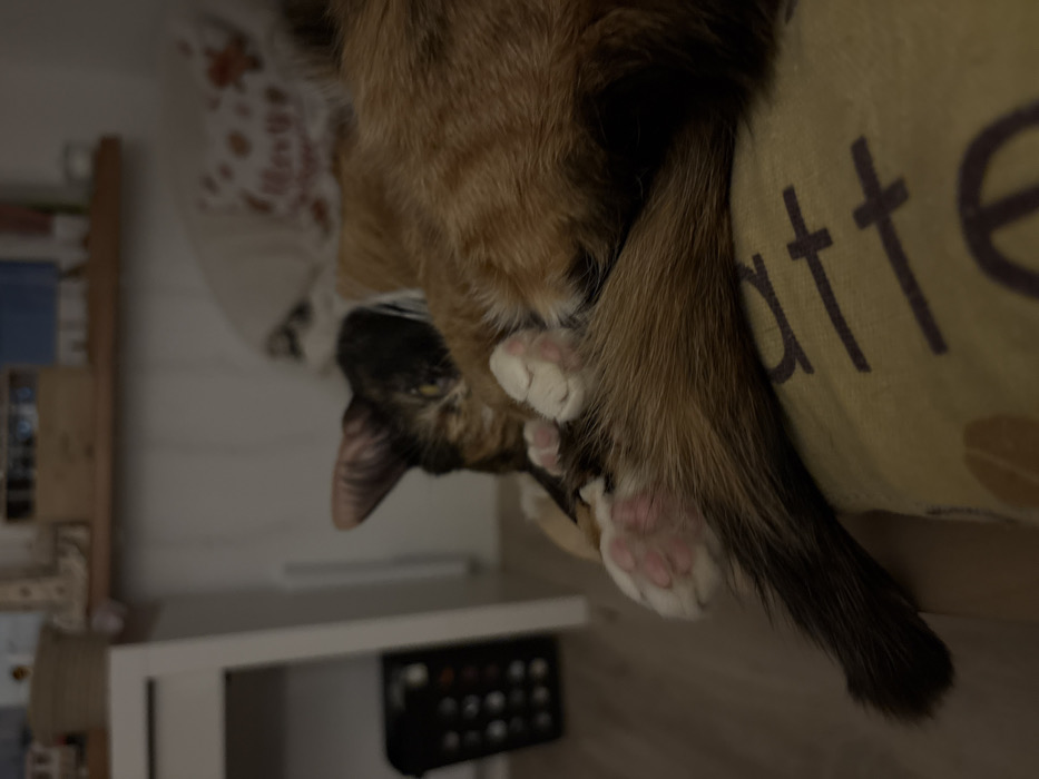 An upside-down image showcases two cats. An orange cat's body is prominent, with paws featuring pink toe beans dangling. A tortoiseshell cat's head is visible beneath the orange cat, one ear showing. A dark tail is partially seen, resting against a yellow pillow with purple letters. The background includes a desk, a shelf of books, and a patterned white pillow.