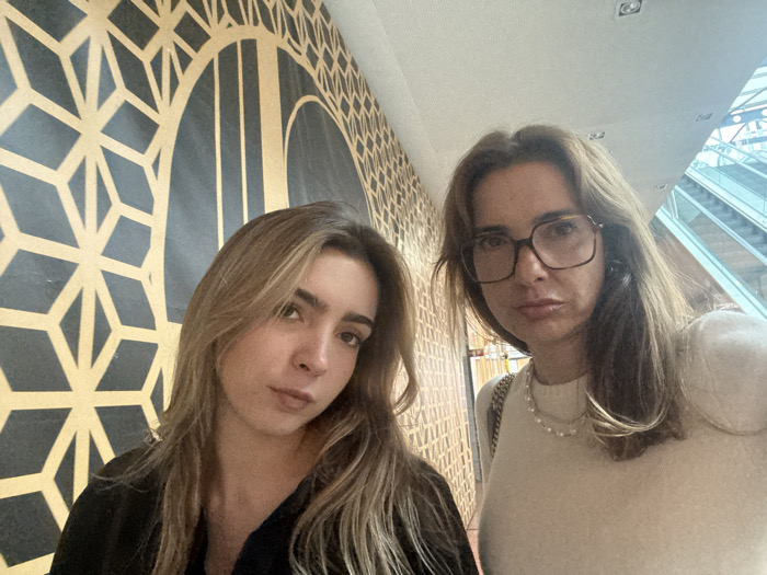 The image displays two females positioned for a selfie in an indoor public space