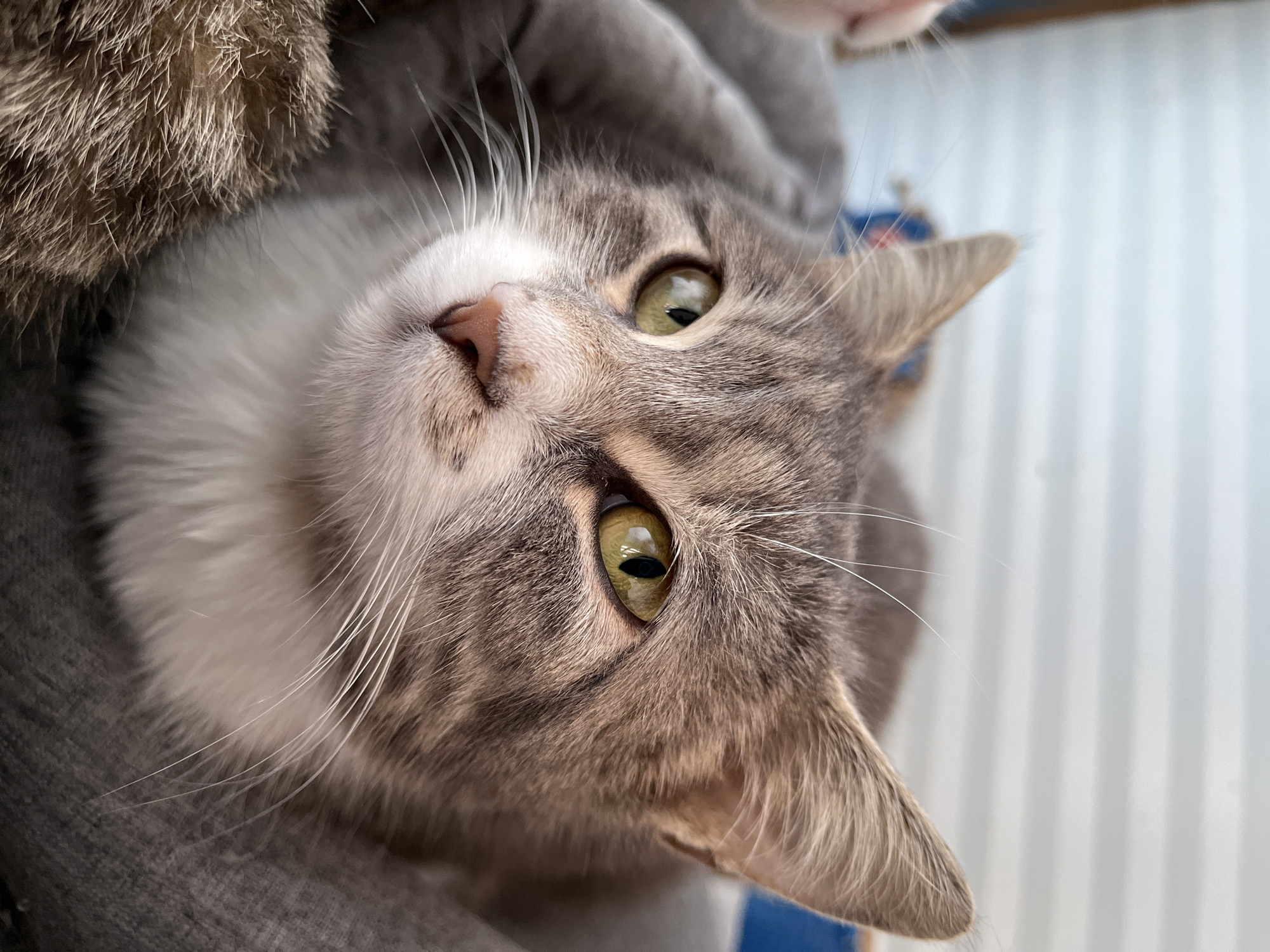 A close-up, angled shot of a gray and white cat with green eyes. The cat is lying down with its head tilted upwards, looking directly at the camera. The cat has gray tabby fur on its head and ears, with a white chin and chest. Long white whiskers are visible. The cat is lying on a gray fabric surface. The background is a light gray with vertical white stripes. The image does not show any evidence of being located in Shumen, Bulgaria.