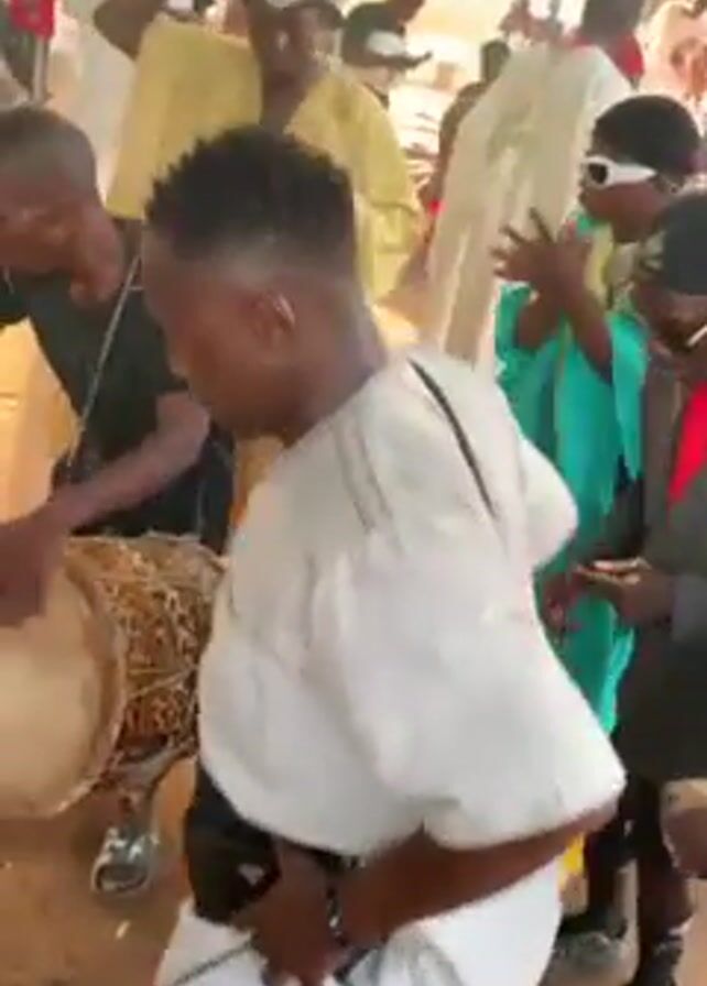 The video depicts a lively outdoor scene, likely a celebration or cultural event. A man in a white traditional garment dances in the foreground, while another man beside him plays a drum. Several other people are visible, dressed in various colorful outfits. Some people appear to be interacting with each other. The setting seems to be a village or a rural area, with trees and simple buildings visible in the background. The ground appears to be covered in dirt.