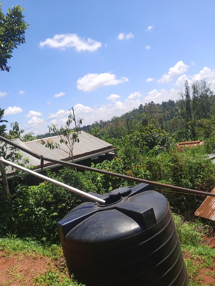 This image depicts an outdoor scene in Kiangochi, Kenya, under a clear blue sky with scattered white cumulus clouds. In the immediate foreground, a black, vertical, ribbed plastic water storage tank occupies the lower right quadrant, with a light-colored pipe extending into its top opening. A darker metal pipe runs horizontally above and behind the tank. The ground slopes downwards from left to right, covered with reddish-brown earth and green grass and weeds. In the mid-ground, dense green vegetation, including bushes and trees, predominates. To the left, a building with a grey corrugated metal roof is partially visible, alongside a small tree with green fruits. Further right, a section of a rusted corrugated metal roof is present. Utility lines are strung across the mid-ground. The background features distant hills and mountains heavily covered in green trees, indicating a forested landscape. No individuals are visible.