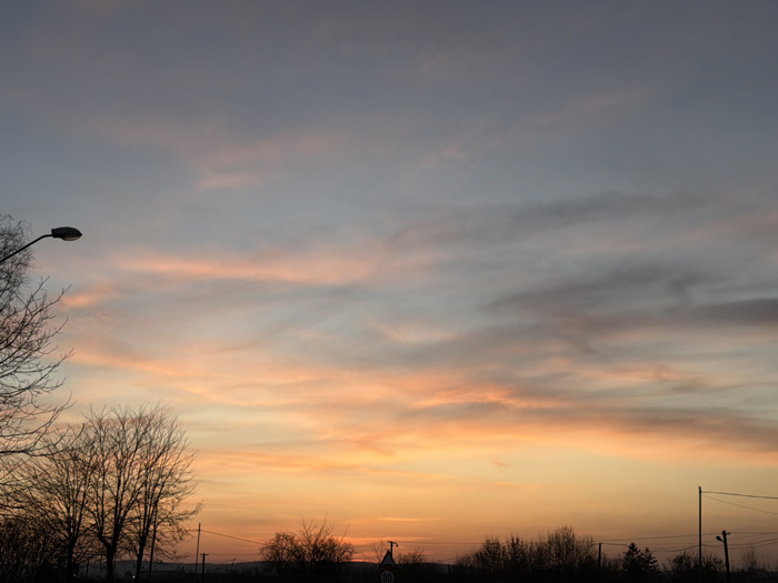 The image depicts an outdoor scene in Târgu Mureș, Romania, at either sunrise or sunset, likely during late autumn or winter. The sky dominates the frame, exhibiting a gradient of colors from muted blue-grey at the top, transitioning through pink and orange bands in the mid-section, to a vibrant yellow-orange at the horizon. Sparse, wispy clouds are distributed across the sky. The lower quarter of the image presents a silhouetted landscape. Numerous bare deciduous trees, lacking foliage, form a dark, irregular line along the horizon and extend upwards from the left and central-left. A dark, curved streetlight pole with its luminaire head is visible on the far left, extending from the lower-left corner into the upper-left sky. Towards the center-right, a faint, circular road sign with a red border is partially visible above the tree line. On the right side, two dark utility poles with overhead wires are silhouetted against the bright sky. Distant, indistinct structures or hills are faintly visible along the horizon line. No people or animals are present, and no actions or interactions are depicted.
