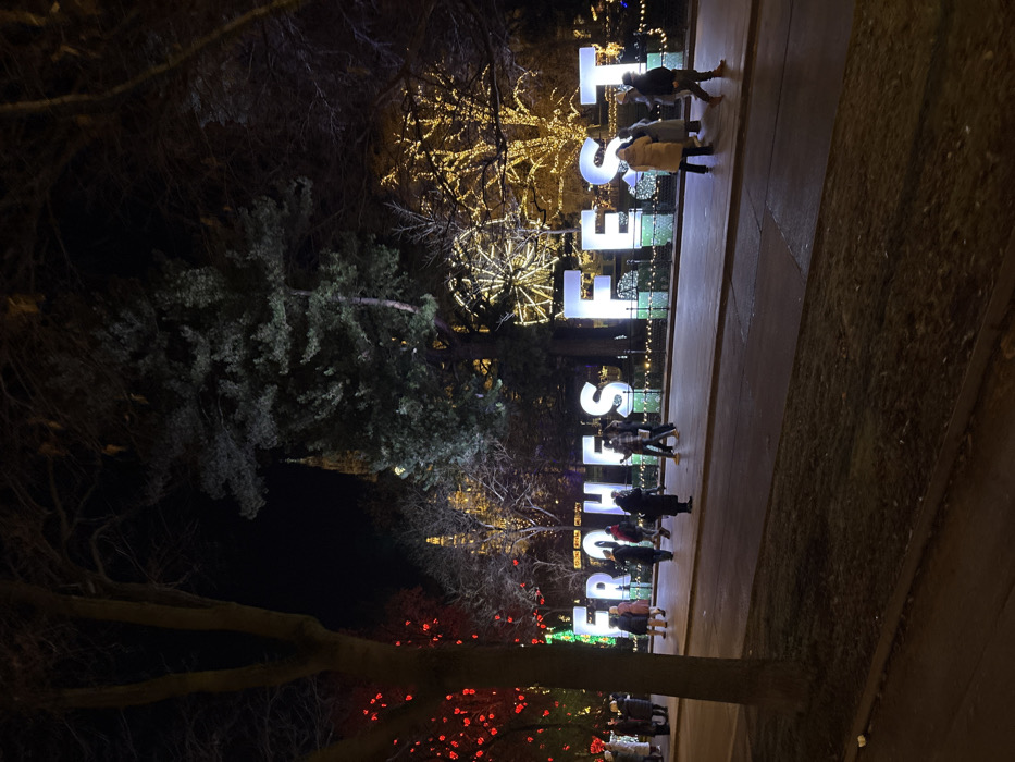 A nighttime scene captures a festival atmosphere. The lit-up letters "FEST" are prominently displayed at the top, while "FROHES" is at the bottom, with people milling around. A Ferris wheel and trees adorned with lights are visible in the background, creating a festive ambiance. A tree with red lights stands out on the left side. The image is slightly rotated, presenting an unusual perspective.