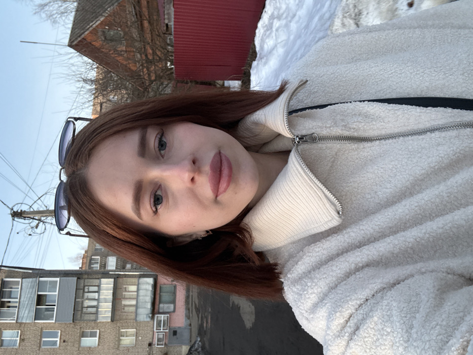 A young adult female is depicted in a close-up, outdoors selfie in what appears to be a residential area of Bol'shie Mkhi, Russia, during a cold season with visible snow