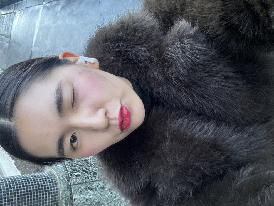 The image depicts a close-up, chest-up portrait of a female subject in the city of Paris, France. The subject has dark hair pulled back and is shown with her left eye open and her right eye closed in a wink. Her lips are pursed and coated with red lipstick, and her cheeks exhibit applied blush. A white wireless earbud is inserted into her right ear. She is wearing a dark brown or black furry coat over a black turtleneck garment. The background is blurred, showing a curved structure with dark green, possibly tiled, surfacing to the subject's left, and a grey, flat surface, consistent with pavement, to her right. The specific location within Paris is not identifiable from the visual content.