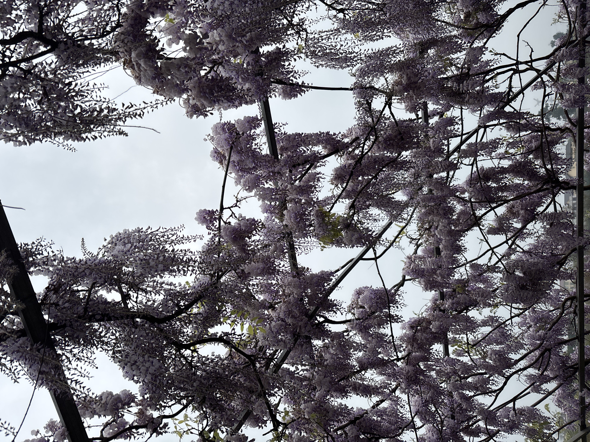 The image is a low-angle shot looking up through a dense canopy of flowering wisteria vines