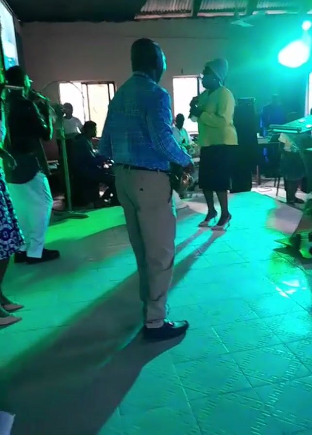 small band performing in what appears to be a church or community hall. The band consists of a saxophone player in a blue checkered shirt and khakis, two singers, and a keyboard player who is seated. A woman in a green top and black skirt dances near the saxophone player. The room is lit with green and blue lights and has a checkered tile floor. In the background, there are other people sitting or standing. A poster for "Unlimited Favour" is visible on the left side of the frame.