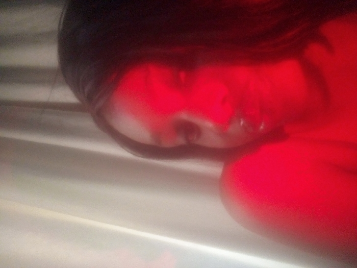 A person lies on a white surface, possibly a bed. The individual has dark hair and their face is visible, though partially obscured by a strong red light. The red light creates a stark contrast and alters the perception of the person's features. The surroundings are indistinct due to the intensity of the red lighting, creating a blurry and somewhat surreal image.