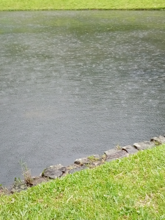 A tranquil view features a body of water, likely a lake or pond, experiencing rainfall. Raindrops create ripples on the water's surface. Lush green grass lines both the top and bottom of the frame, bordering the water. Small rocks are visible along the water's edge, adding texture to the landscape. The overall scene evokes a sense of calm and natural beauty, despite the rainy weather.