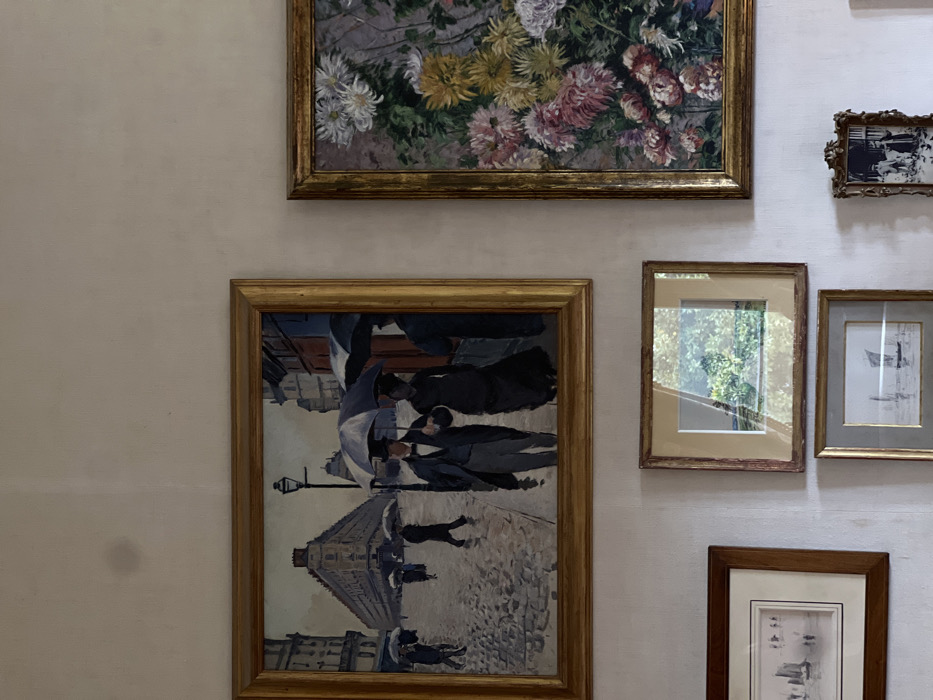 This image displays a section of an interior wall, presumed to be within Claude Monet's house in Giverny, France. The wall is a light, neutral color, possibly off-white or beige, with minor visible imperfections. The dominant artwork is a large, rectangular, horizontally oriented painting centered on the left side of the frame, encased in a gold-toned ornate frame. This painting is a reproduction or copy of Gustave Caillebotte's "Paris Street; Rainy Day." It depicts a wet Parisian street scene under an overcast sky. In the foreground, a man in a top hat and a woman in a dark dress walk arm-in-arm, both holding dark umbrellas. Numerous other figures are visible in the middle and background, also holding umbrellas and traversing the cobblestone street, which reflects light due to the rain. Architectural buildings line the street, including a prominent triangular-faced building in the distance. To the right of this painting is a large, vertically oriented floral painting, also in a gold-toned frame. It depicts a dense arrangement of various chrysanthemums and dahlias in shades of white, yellow, pink, and purple against a darker background. Below the "Paris Street; Rainy Day" painting, three smaller framed artworks are arranged. From left to right: 1. A horizontal, sepia-toned or monochrome print/drawing of sailboats on water with distant figures, framed in dark wood. 2. A smaller, horizontal framed landscape print or photograph, largely obscured by reflections from a window or light source, showing green foliage. 3. A very small, ornate, dark-framed photograph or print, depicting two figures, one possibly a child, in a traditional setting. Below the landscape print, another smaller, horizontal framed monochrome print or drawing of sailboats on water is visible, framed in a light grey or silver-toned frame.