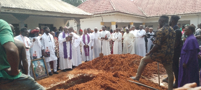 A gathering of people surrounds a freshly dug grave, attended by religious figures in white and purple robes
