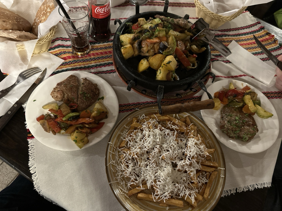 This image depicts a dinner table scene in a restaurant in Bansko, Bulgaria