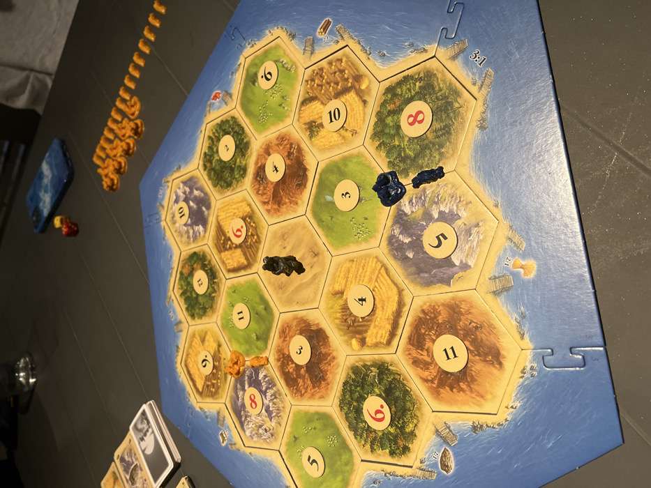 A Catan board game is partially set up on a gray surface