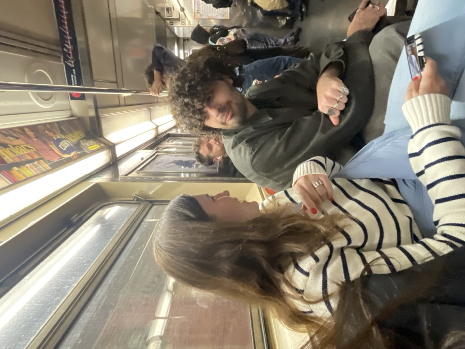 The image depicts the interior of a New York City subway car, likely on a line serving Broadway and Avenue L, indicated by overhead signage. The car is illuminated by fluorescent strip lighting and features multiple rectangular windows and metallic handrails. In the foreground, two individuals are seated and engaged in interaction. A young adult female on the left has long, wavy brown hair and is wearing a white sweater with horizontal navy blue stripes and light blue pants. Her left hand displays red nail polish and a silver ring, while her right hand holds a smartphone horizontally, showing a visual display. She is turned towards the male subject. On the right, a young adult male with dark, curly hair and a beard is wearing a dark olive green long-sleeved collared shirt and dark pants. He is looking towards the female. His left hand, resting on his lap, wears multiple silver rings. In the mid-ground, other passengers are visible, out of focus. One male with a beard wears earbuds. Another person holds a vertical handrail, and further back, an individual in a dark hooded garment is visible among other indistinct figures. The car appears to be in motion or recently stopped, with reflections visible on the windows.