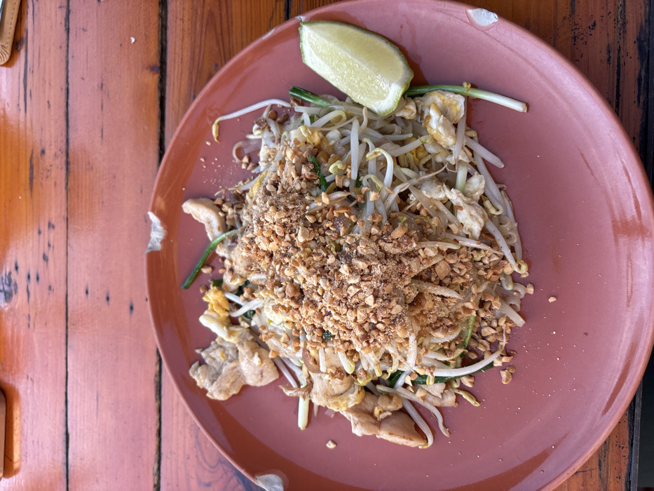 A terracotta-colored plate, exhibiting chips along its rim, contains a serving of stir-fried noodles. The dish features bean sprouts, sliced chicken pieces, scrambled egg, and chopped green onions, generously topped with crushed peanuts. A wedge of lime rests on the right side of the plate. The plate is positioned on a rustic, orange-brown wooden table with visible grain and imperfections. This scene is located in Pai, Thailand.