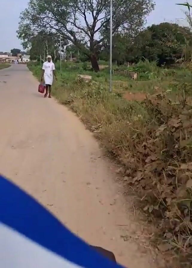 person on a dirt road, possibly riding a bicycle or motorcycle, passing a woman in a white uniform walking along the road. The woman is carrying a red bag. A large tree and a solar-powered street light are visible on the side of the road. The surrounding area consists of grassy fields and scattered trees.