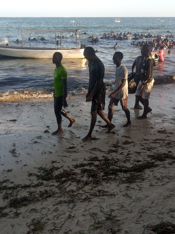 The image depicts a crowded beach scene in Shanzu ward, Kenya, during daylight hours