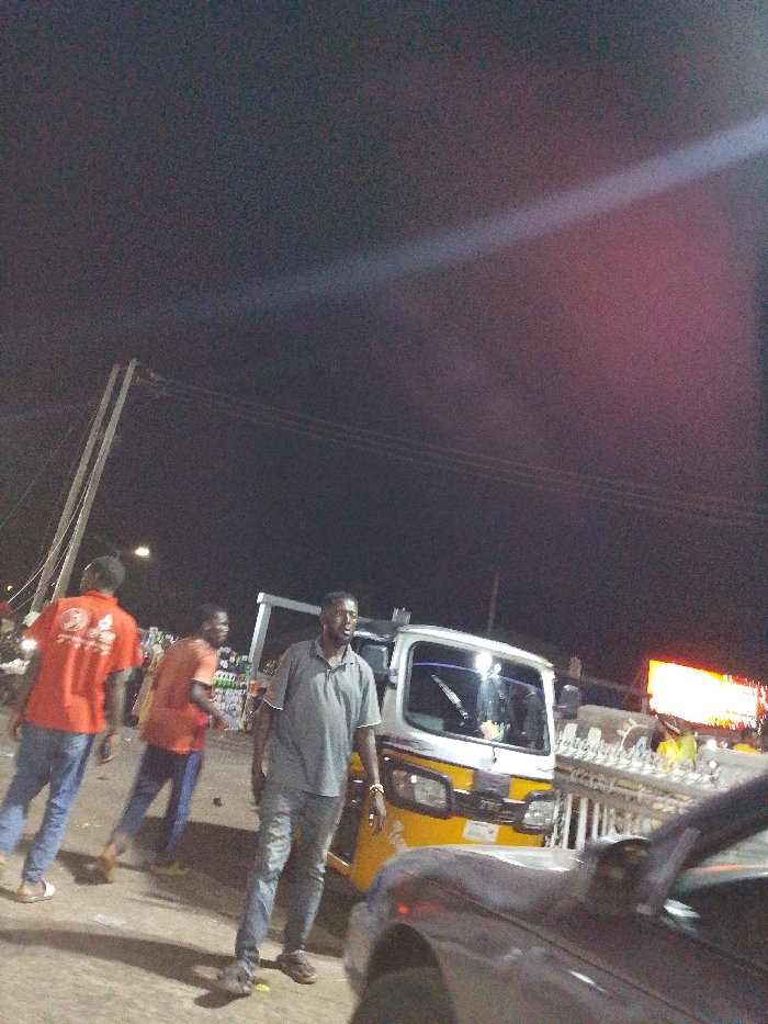 At night, a man stands in front of a three-wheeled vehicle. He wears a grey shirt and jeans. To the left, two other men in orange and red shirts walk away. Behind the vehicle, a makeshift structure displays numerous bottles. A nearby street light illuminates the scene, and a blurred vehicle is visible in the foreground. The sky is dark, and a streak of light is present at the top of the image.