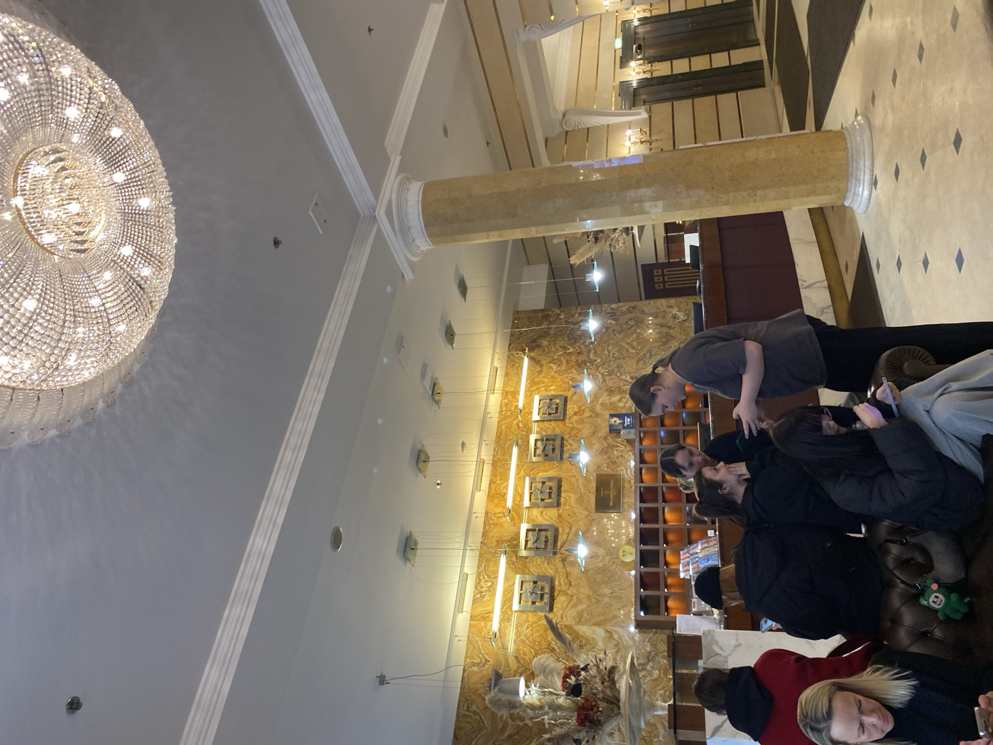 The scene depicts the lobby of the Best Western Plus Centre Hotel on Nevsky Prospekt in Saint Petersburg, Russia. The environment features a high ceiling with a prominent, large, multi-tiered crystal chandelier illuminating the space. The ceiling is white with decorative crown molding. A large, ornate fluted column with a capital, composed of a light brown and white marble-like material, stands on the right, extending from floor to ceiling. The floor is covered in light-colored tiles with small dark square inlays. The main wall behind the reception desk is clad in polished, mottled orange and brown marble-like material. Mounted on this wall are six square clocks displaying different world time zones, labeled "NEW YORK," "LONDON," "BERLIN," "MOSCOW," "DUBAI," and "BEIJING." Below the Moscow clock, a plaque reads "NEVSKY SKY," and another partially visible plaque indicates "BEST WESTERN PLUS." A yellow circular sign with "9.9" is also affixed to the wall. The reception desk itself is dark wood with numerous square compartments and a lighter-colored countertop. To the far left, a decorative arrangement of dried plants and red floral accents rests on a pedestal. Two dark-paneled elevator doors are visible to the right of the large column. Eight individuals are present. In the foreground and midground, a group of five people are seated on a dark, tufted leather-style sofa. One woman with blonde hair, wearing a dark top, is seated in the immediate foreground, looking down at her smartphone. Behind her, a person in a red hooded sweatshirt and a person in a black beanie and black jacket are seated with their backs to the camera. Another woman in a black jacket and light-colored pants is seated, also looking at a smartphone. A small green plush character (frog-like) hangs from a bag on the sofa. Near the reception desk, a group of three young women are standing and interacting. One woman in a dark grey short-sleeved top and dark pants is holding a smartphone and engaging in conversation with another woman in a dark long-sleeved top, who is looking towards the reception. A third woman in a dark long-sleeved top is partially visible between them. Another young woman with dark hair is also visible in the vicinity of the reception desk. Most individuals are either using or holding smartphones.