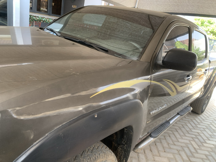 The scene is located in Kurudu, Nigeria. The image displays a static view of a dark metallic brown (or bronze) Toyota Tacoma double cab pickup truck, positioned under a beige mesh canopy, angled slightly towards the right. The truck's body, including the hood, windshield, and side panels, is covered in a visible layer of dust, with streaking present, indicative of environmental exposure. A distinctive yellow and black striped decal is applied horizontally along the front fender and front door. Black plastic fender flares are installed over the wheel arches, and chrome tubular running boards with black step pads are affixed beneath the doors. The ground surface where the vehicle is parked consists of light-colored, possibly beige or gray, interlocking pavers arranged in a herringbone pattern. In the background, to the upper left, a section of a building with dark-colored walls and a reflective window is visible, adorned with a green, leafy garland. No individuals are present, and no actions or interactions are depicted within the frame.