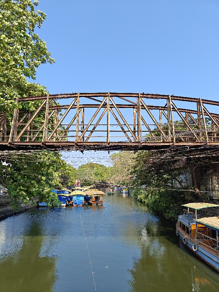 The image depicts a canal scene in Alappuzha, India, on a clear, sunny day. A prominent, weathered metal truss bridge, exhibiting significant rust and a brown coloration, spans horizontally across the upper middle of the frame. Its intricate latticework forms a robust overhead structure. Beneath the bridge, a canal with dark green-blue water flows. The banks of the canal are lined with dense green foliage and mature trees, some overhanging the water. On the left side of the canal, a cluster of approximately five to seven houseboats or similar vessels are moored. These boats feature distinctive blue tarpaulin coverings and natural-toned (likely bamboo or thatch) roofs. Further down the canal, additional smaller boats, some with yellow or blue coverings, are visible in the distance. On the immediate right, a larger, partially cropped blue and brown boat, likely a tourist or houseboat, is moored with white fenders visible along its side. The right bank behind it shows dense greenery partially obscuring a structure with a white wall and some architectural details. A thin, light-colored line or rope extends diagonally across the water from the lower left, disappearing towards the lower right. The sky overhead is a clear, bright blue. No individuals are distinctly visible engaging in specific actions.